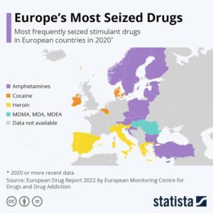 As mentioned previously, in its discussion of a related phenomenon in neighbouring countries, the European Drug Report for 2022 noted that although an increasing number of sophisticated extraction and processing facilities for turning coca base into cocaine had been detected in Europe during the preceding period (mainly in the Netherlands, Spain and Belgium), no major interceptions of coca base originating from Bolivia and Peru had been reported over the same period (scientific analysis of the coca leaves used to make the coca base had identified those two countries as the most likely source), all of which suggested that at least one major trafficking route had still not been identified (raising the further possibility that other major trafficking networks have similarly managed to evade detection over long periods of time).