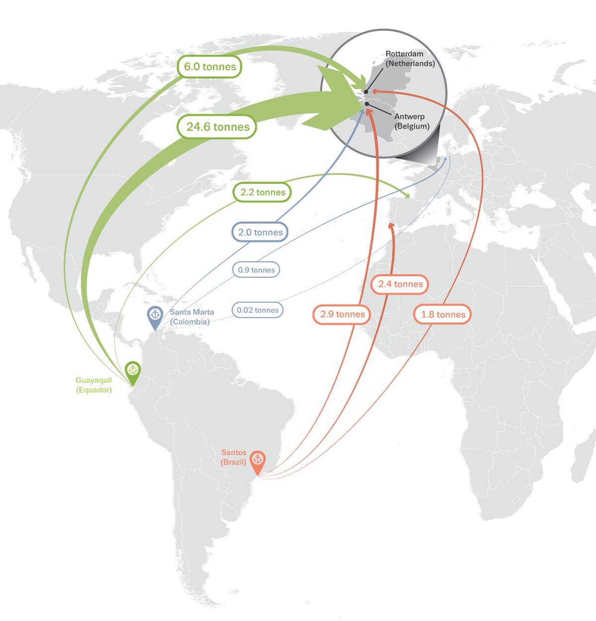 More generally, after a comprehensive analysis of publicly available information as well as consultations with relevant law enforcement officials in Latin America and Europe, the European Drug Report determined that approximately 282 tonnes of cocaine destined for Europe had been intercepted in 2020 (171 tonnes in or on route to European ports, and 108 tonnes at major international shipping ports in Latin America). Consistent with a trend which had become apparent over preceding periods, most of the cocaine shipments were intercepted in Belgian ports (69 tonnes), followed by the Netherlands (45t) and Spain (26t) – between them, the ports of Antwerp and Rotterdam accounted for 65% of the shipments. In Latin America, most of the intercepted shipments were en route from major ports in Brazil (45 tonnes), Ecuador (24t) and Colombia (18t). Overall, the report states of the main departure points and transshipment points between Latin America and Europe: