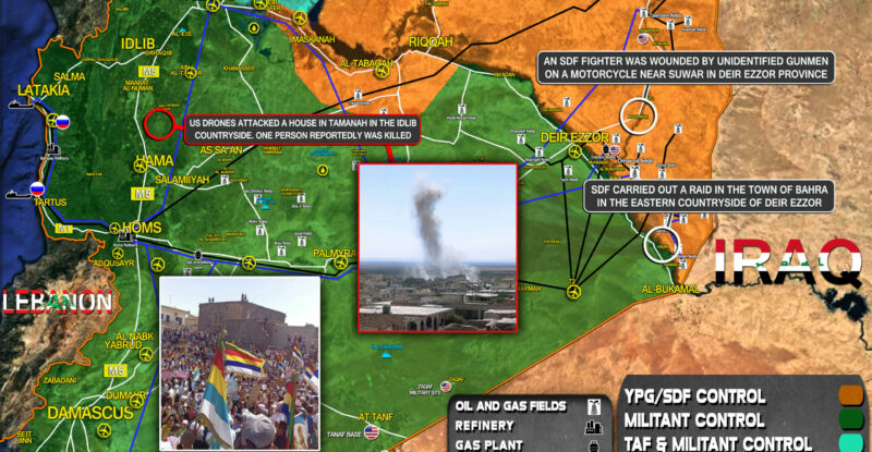 US drones attacked a house in Tamanah in the Idlib countryside. One person reportedly was killed; A protest took place…