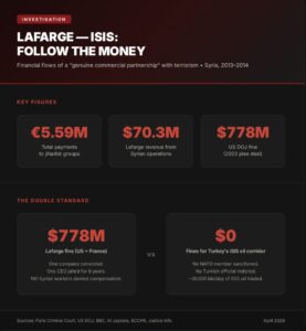 The Lafarge verdict, for all its historic significance, functions as a controlled demolition: take down one visible target to protect the larger architecture. The cement company is the designated scapegoat. The systemic complicity — the intelligence agencies that looked away, the NATO ally that kept the border open, the Gulf funds that kept the money flowing — remains untouched.
