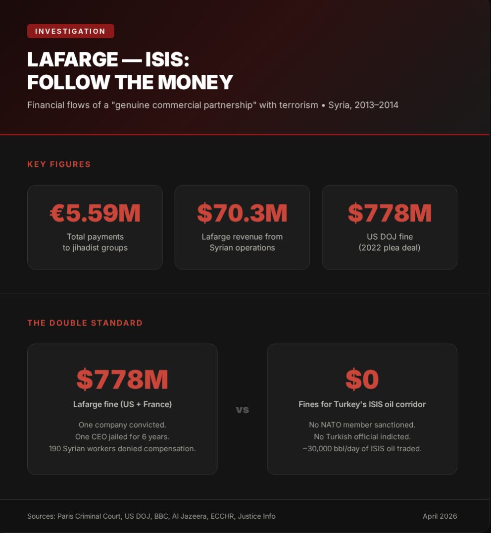 No NATO member has ever been sanctioned for this. No Turkish official has been indicted. No corporate entity involved in the Turkish-ISIS oil trade has faced a fraction of the scrutiny Lafarge received.