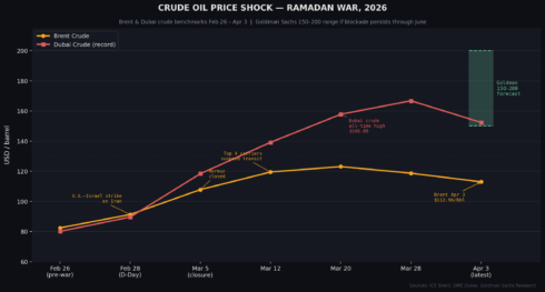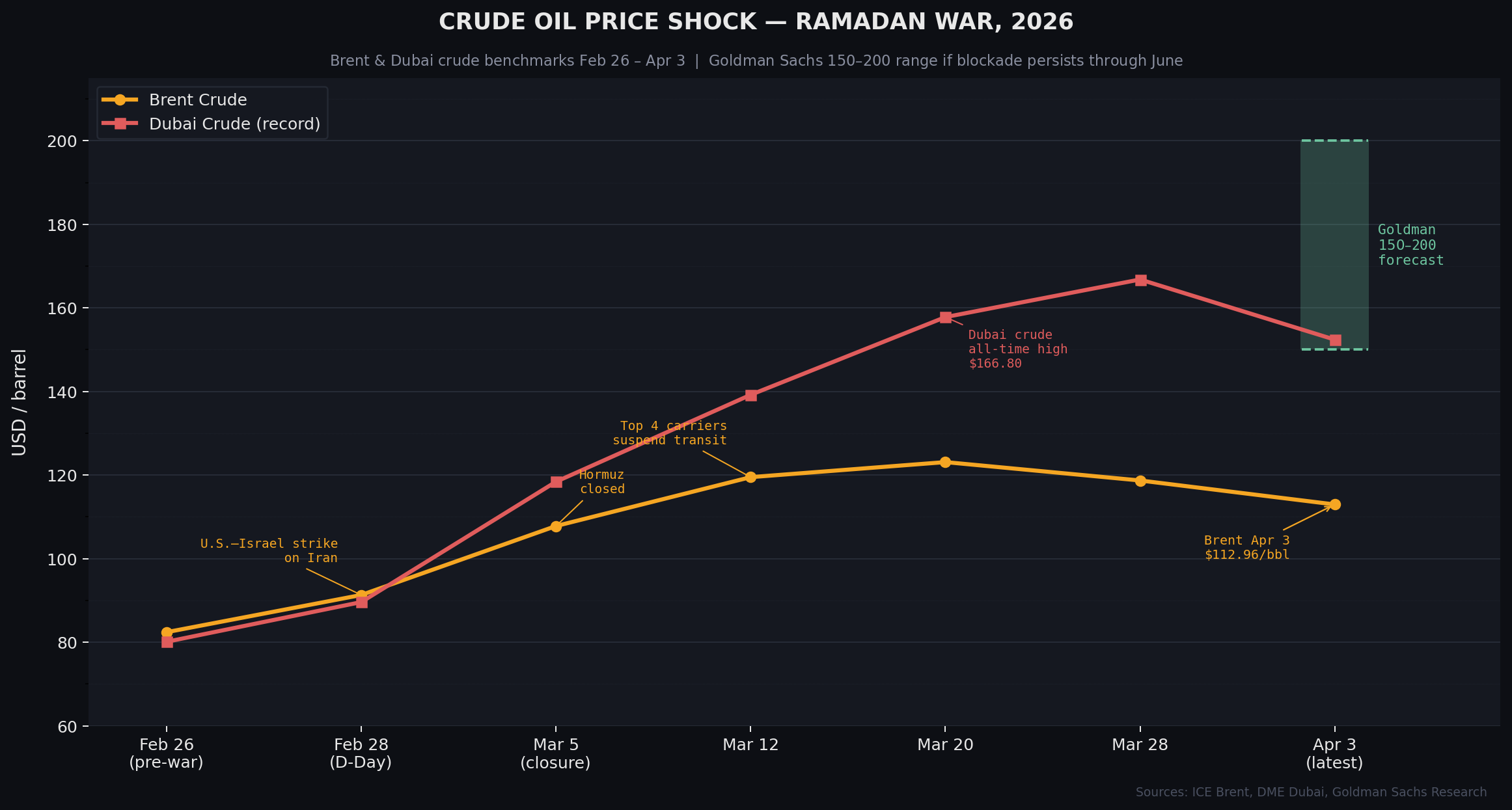 - As of April 3, Brent closed at $112.96, with Goldman Sachs warning of a $150–$200 range if the blockade persists through June.
