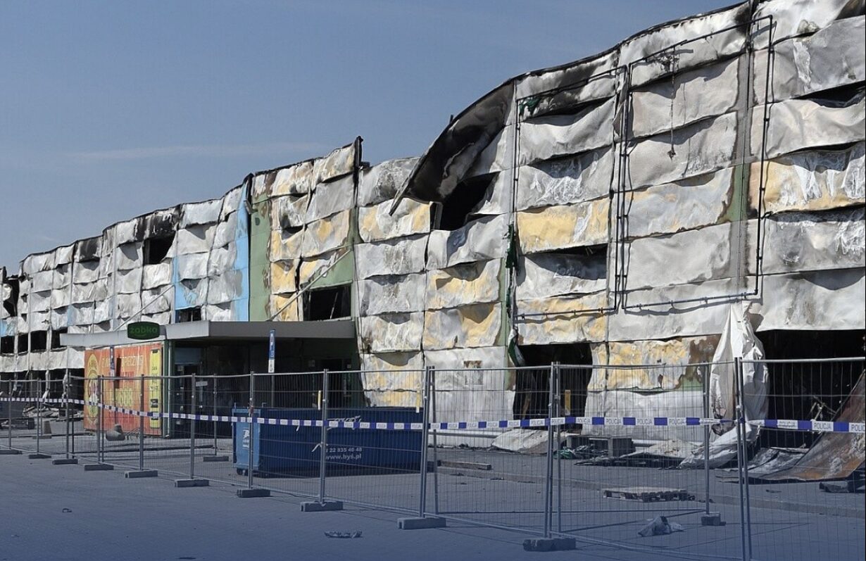 Burned-out Marywilska mall in Warsaw — the Polish government is using this arson to pin the blame on Russian intelligence services, yet the fact that all the perpetrators were Ukrainians already says a lot