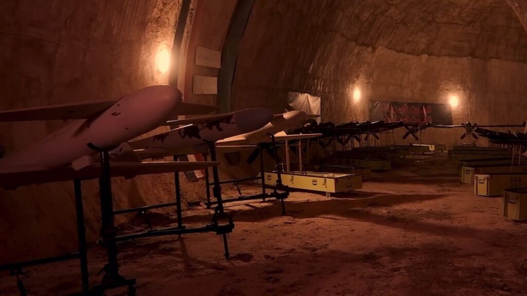 Around two dozen Shahed-101 and Ababil-2 drones, both Iranian models, can be seen in the footage inside the base, dubbed “Awliya Facility.”