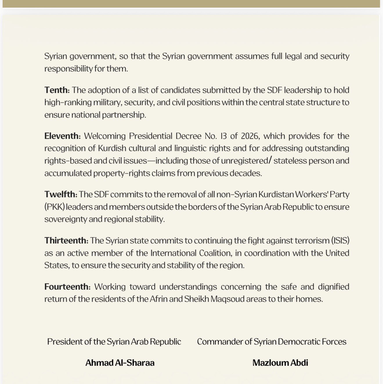 SDF personnel will be individually incorporated into Damascus’ military and security forces after security vetting, receiving official ranks, salaries, and benefits. The agreement also promised to safeguard the administrative and social autonomy of Kurdish-majority areas.