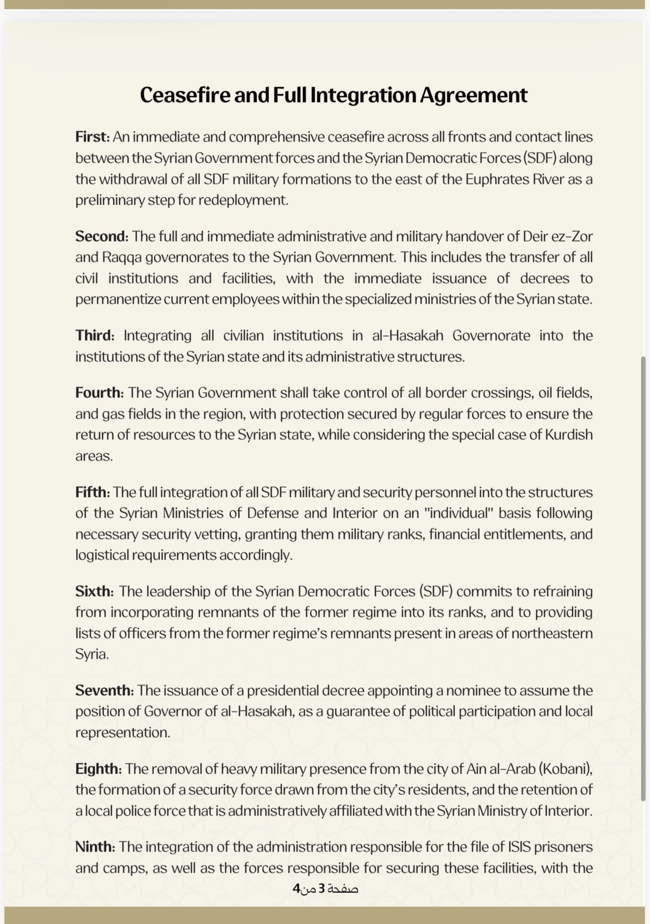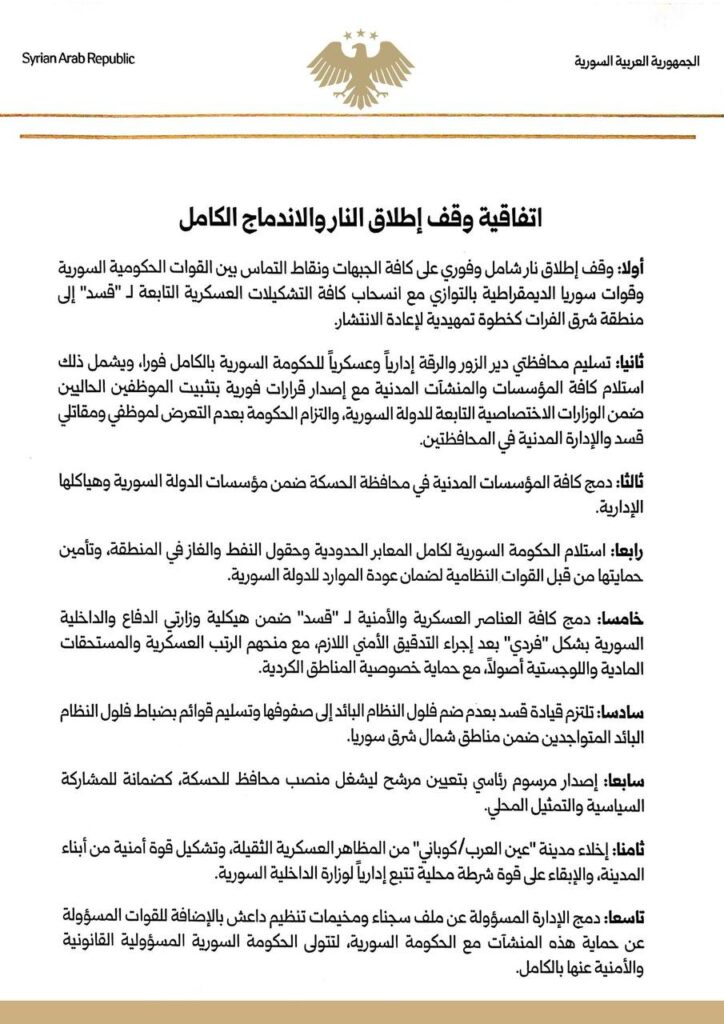 The agreement also states that Sharaa will appoint a governor for al-Hasakah, and heavy military presence will be removed from the town of Kobani in the governorate of Aleppo, where the majority of the population is also Kurds.