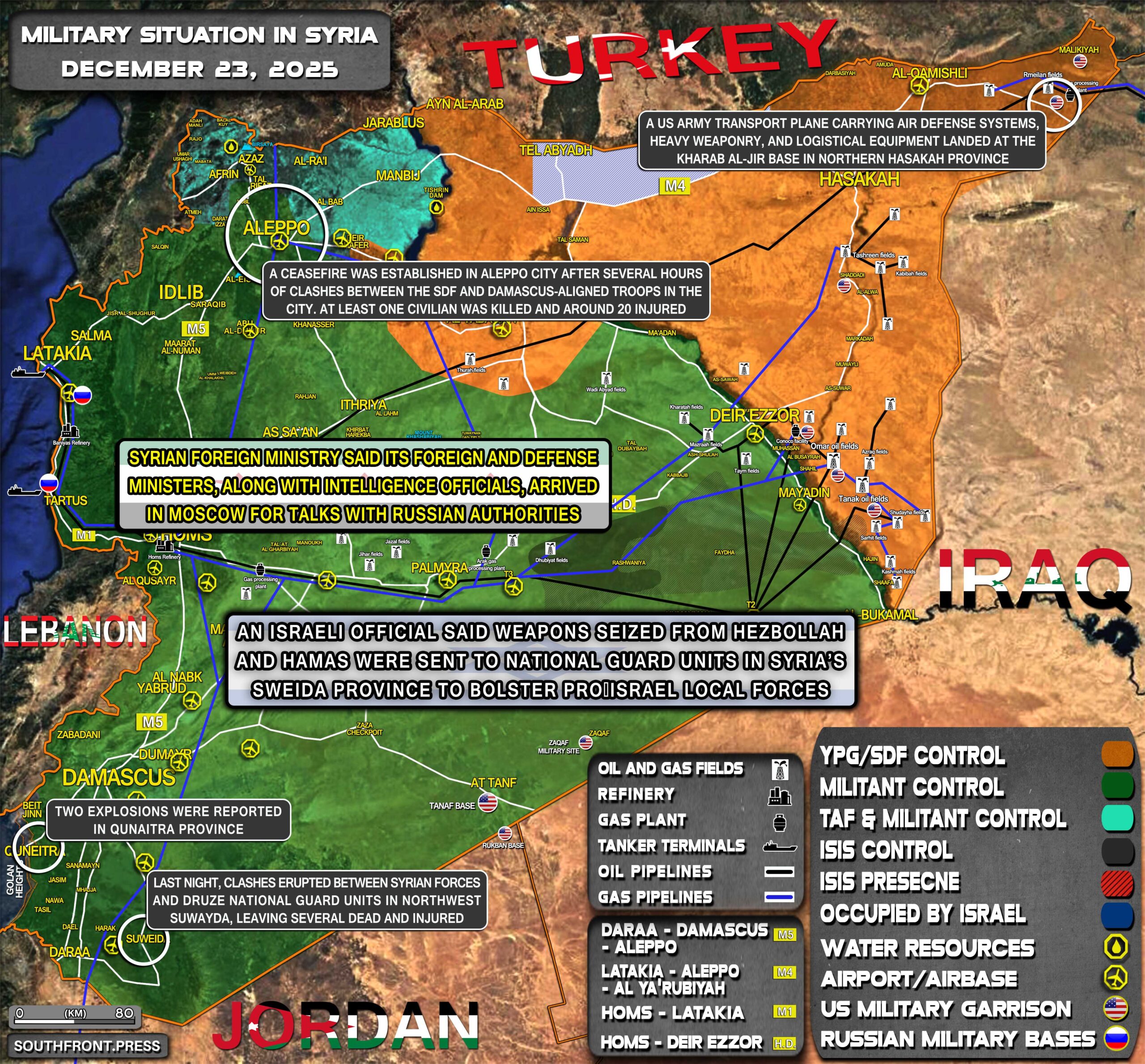 - A US Army transport plane carrying air defense systems, heavy weaponry, and logistical equipment landed at the Kharab al-Jir base in northern Hasakah province;