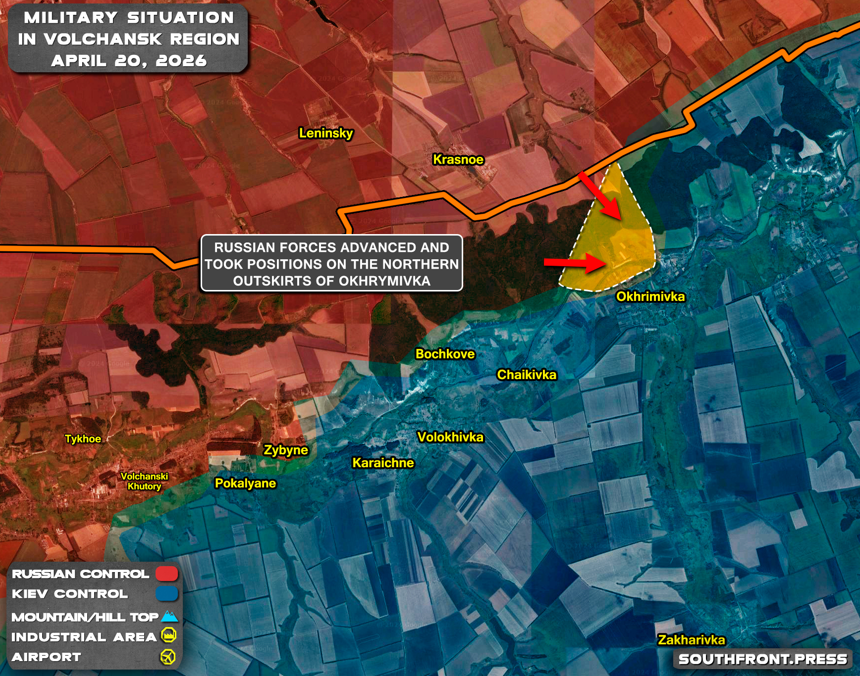 - Russian forces advanced and took positions on the northern outskirts of Okhrymivka.