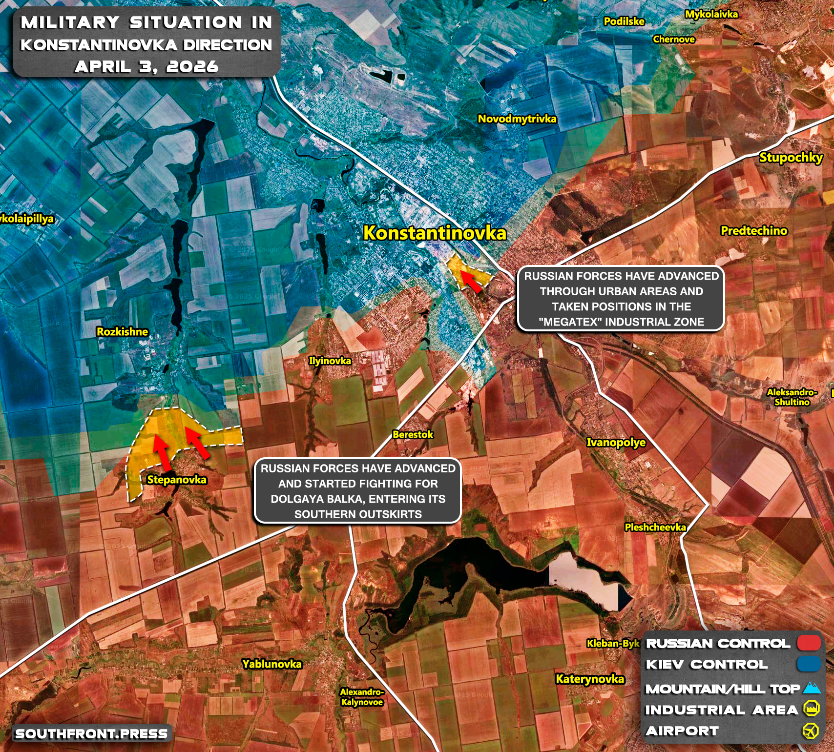 - Russian forces have advanced through urban areas and taken positions in the “Megatex” industrial zone.