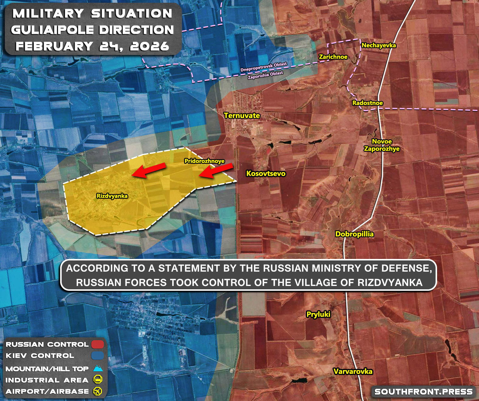 - According to a statement by the Russian Ministry of Defense, Russian forces took control of the village of Rizdvyanka (Rozhdestvenskoye).