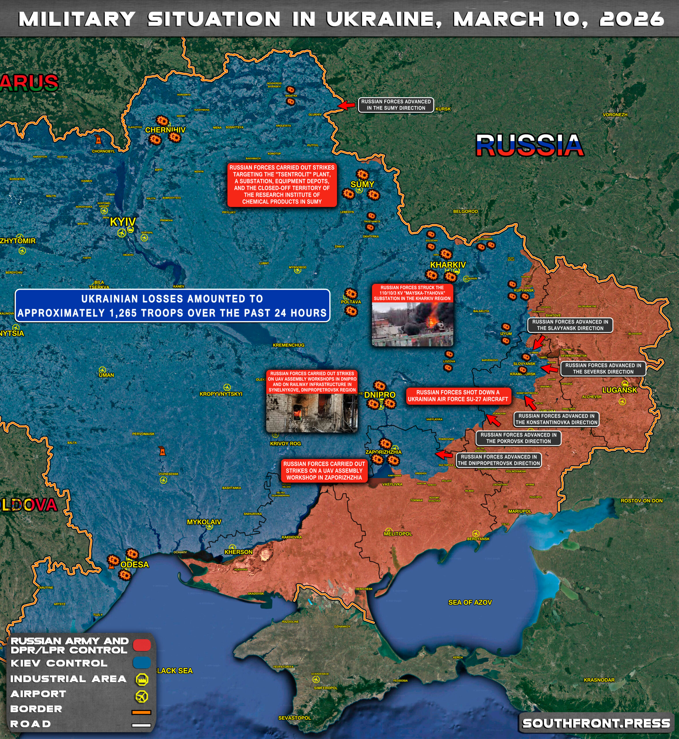- Russian forces carried out strikes targeting the “Tsentrolit” plant, a substation, equipment depots, and the closed-off territory of the Research Institute of Chemical Products in Sumy;
