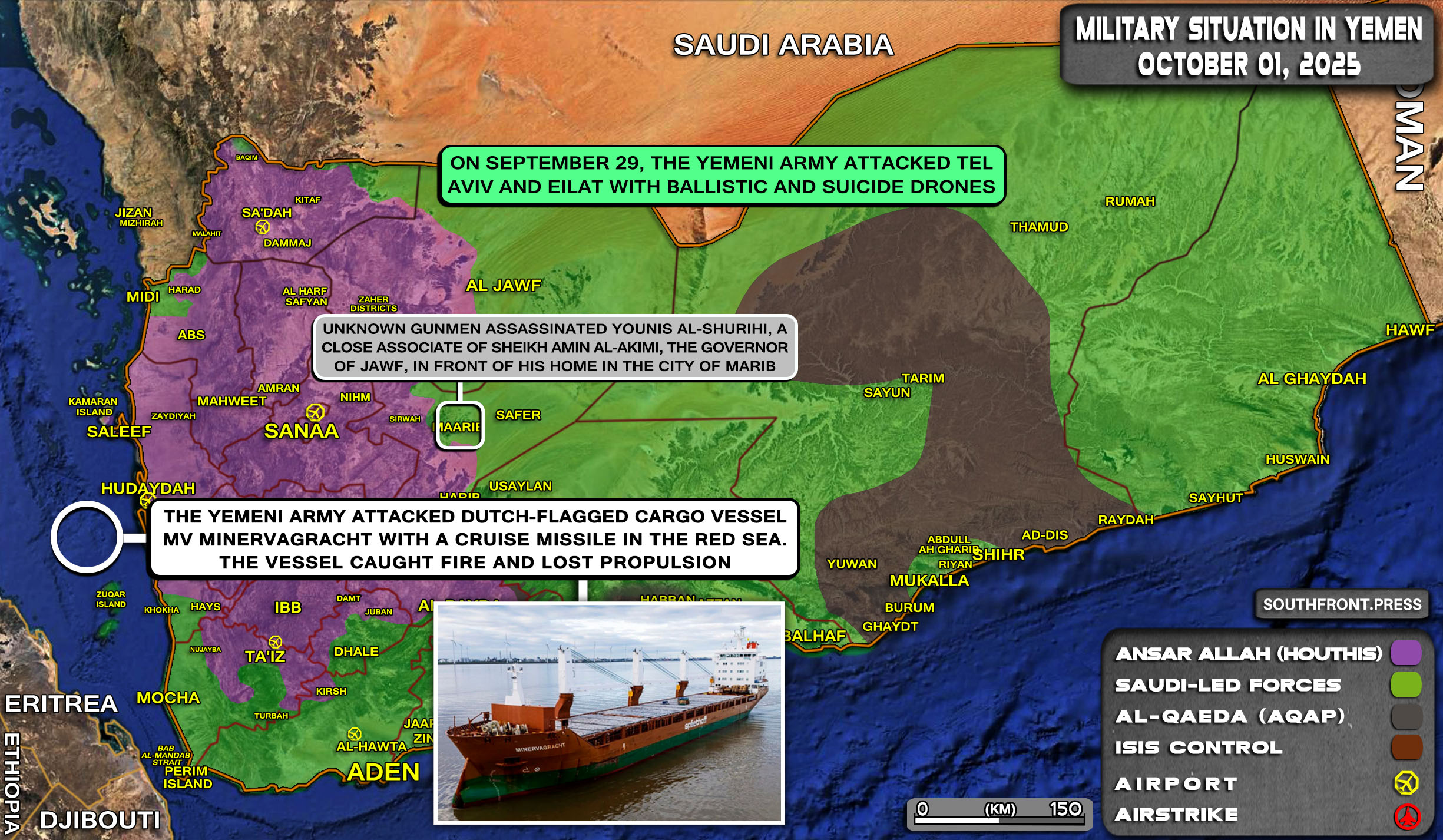 - The Yemeni army attacked Dutch-flagged cargo vessel MV MINERVAGRACHT with a cruise missile in the Red Sea. The vessel caught fire and lost propulsion;