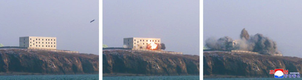 Photos shared by KCNA show two cruise missiles, both believed to be from the Hwasal-1-series, hitting their targets with high accuracy.