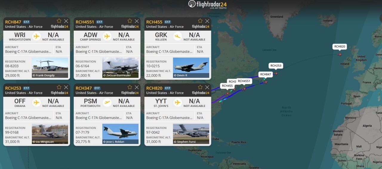 Military transport aircraft are actively transferring cargo from the U.S. to Europe and to the Mildenhall and Fairford air bases in the U.K., as well as the Ramstein air base in Germany. These airfields serve as transit points, and after refueling, the aircraft continue on to the Middle East.