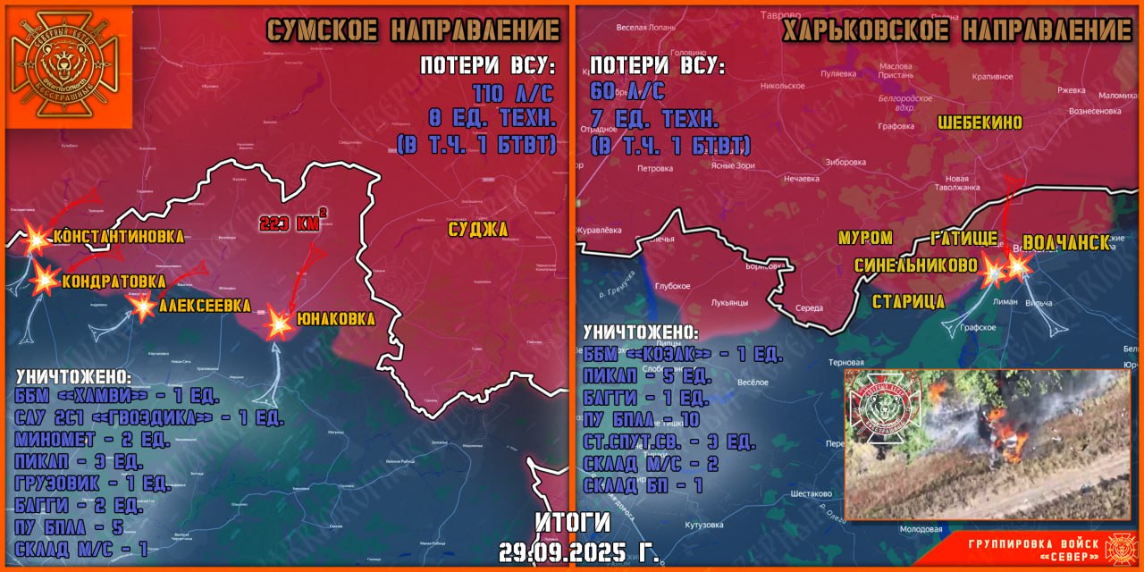 In the Sumy region, the «North» group command reported strikes on Ukrainian Armed Forces units in Pavlovka, Varachino, Novaya Sech, Kondratovka and Andreevka. In the Alekseevka area, Ukrainian forces attempted a counterattack using the 225th Separate Assault Regiment, reinforced by personnel from the 158th Separate Motorized Rifle Brigade. However, they were unsuccessful. Meanwhile, Russian forces reported tactical successes west of Yunakovka.