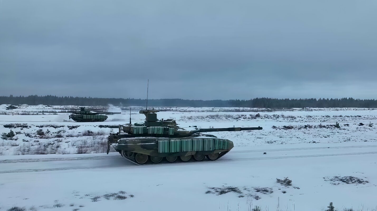 Winter of Reality. Russian T-90M “Proryv” tanks move through the snow. By December 2025, relentless pressure shifted the strategic initiative decisively to Moscow