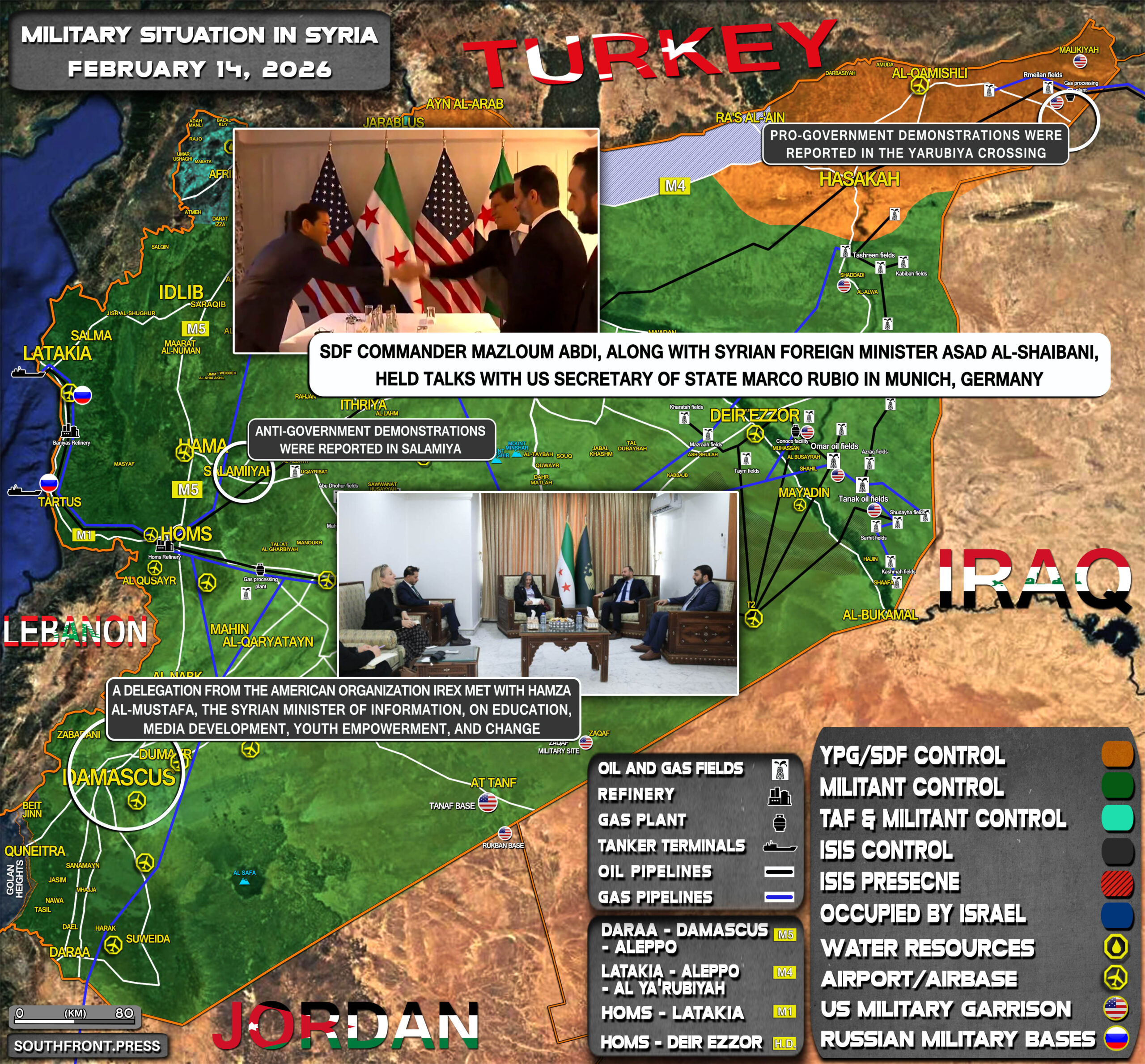 - SDF Commander Mazloum Abdi, along with Syrian Foreign Minister Asad al-Shaibani, held talks with US Secretary of State Marco Rubio in Munich, Germany.