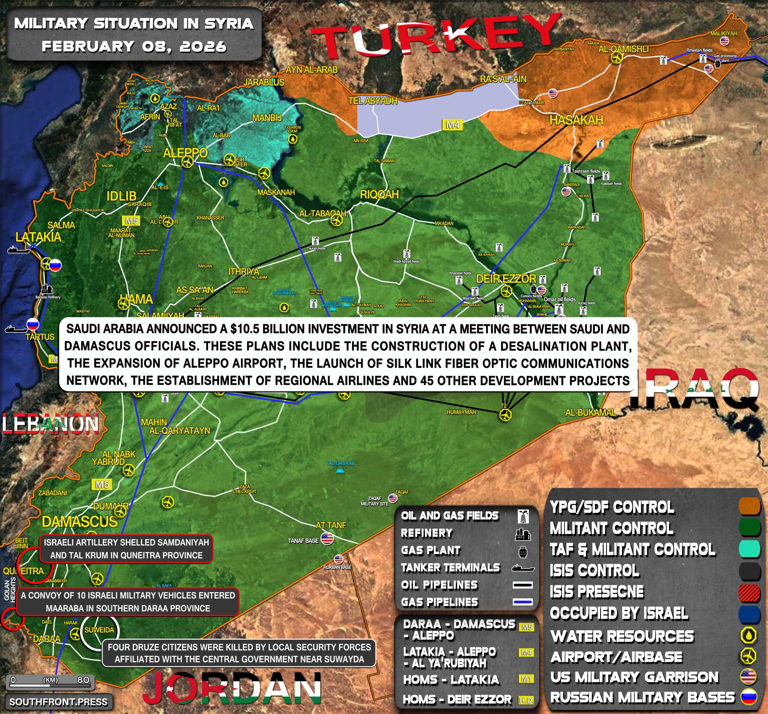 - Saudi Arabia announced a $10.5 billion investment in Syria at a meeting between Saudi and Damascus officials. These plans include the construction of a desalination plant, the expansion of Aleppo airport, the launch of the Silk Link fiber optic communications network, the establishment of regional airlines, and 45 other development projects.