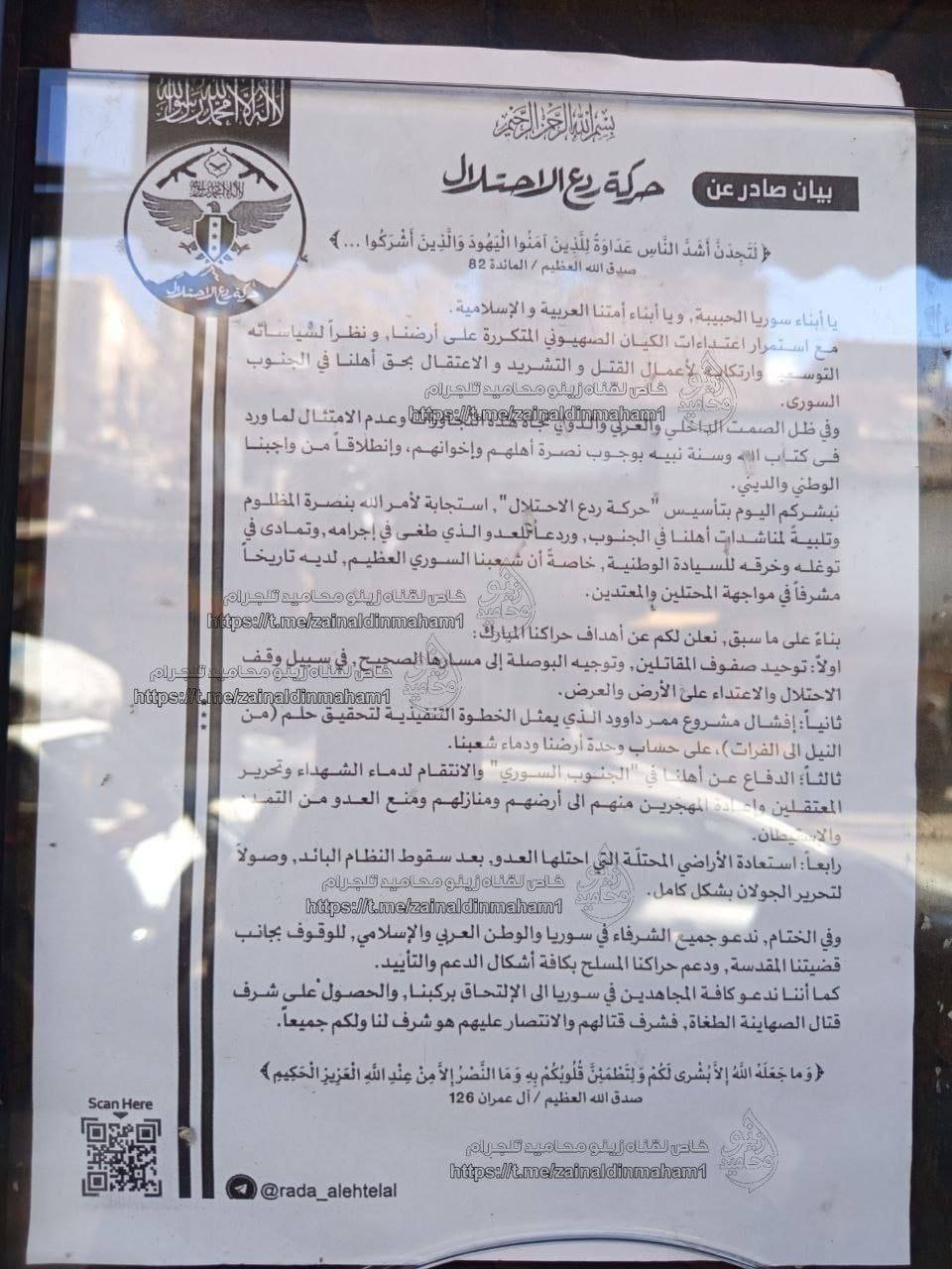 It also promised to defend people in southern Syria, avenge the blood of those who died, liberate the detainees, return the displaced to their land and homes, and prevent the Israelis from expanding and settling.