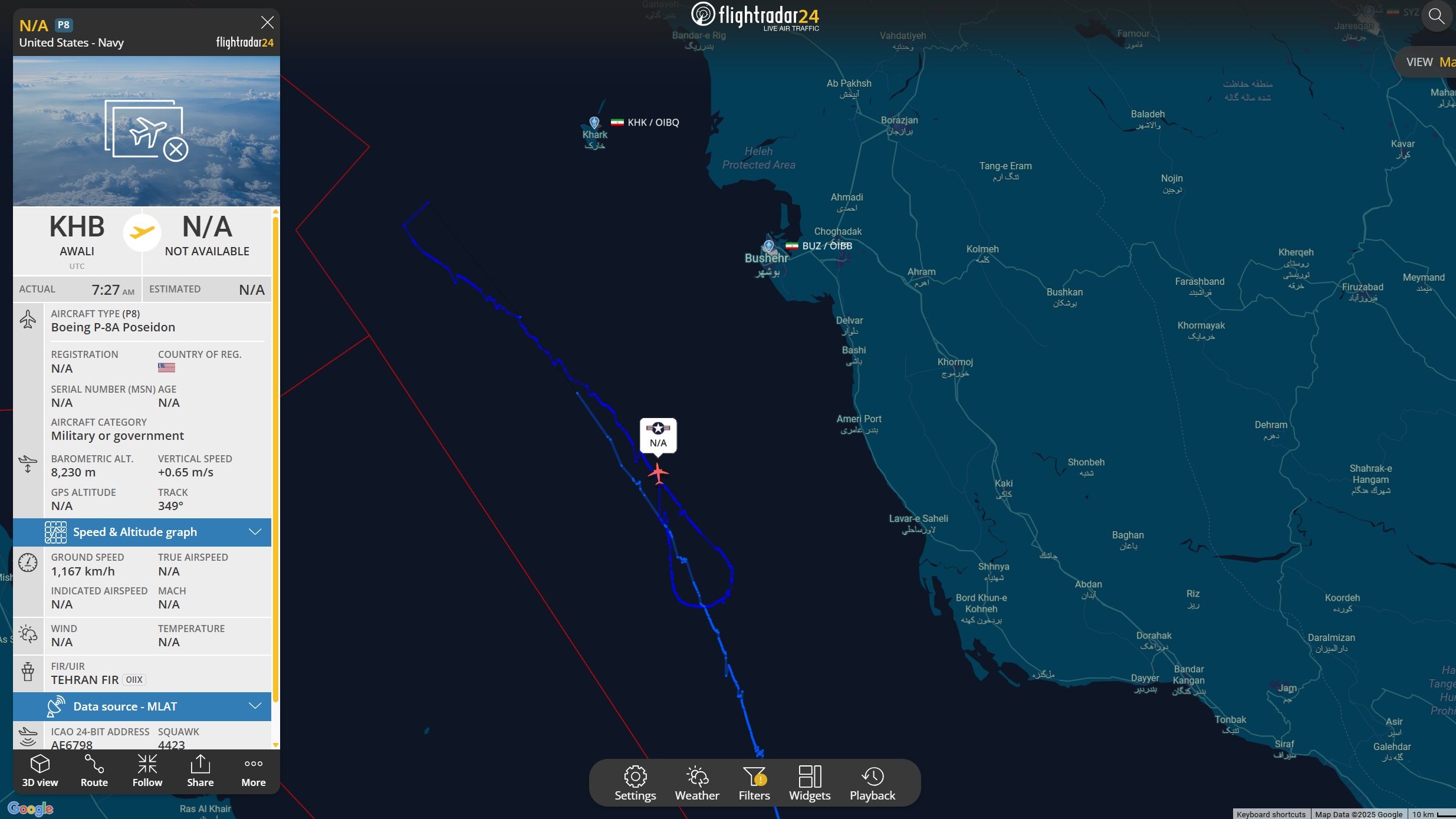 The unusual P-8 Poseidon flight over the Persian Gulf was picked up by Flightradar24 and several other aviation tracking websites. The large reconnaissance plane flew close to the coast of Bushehr, but didn’t violate Iranian airspace at any moment.